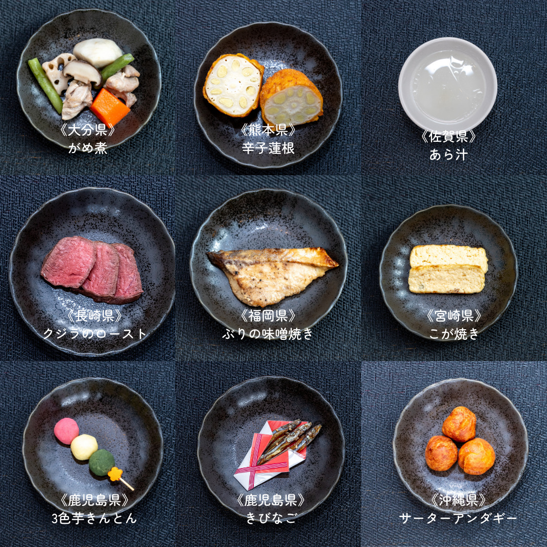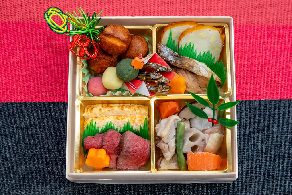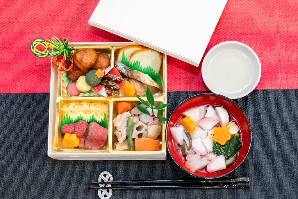 鶏肉、ぶり、かつお菜、にんじん、大根、里芋、しいたけ、焼き豆腐、くず餅、かまぼこ